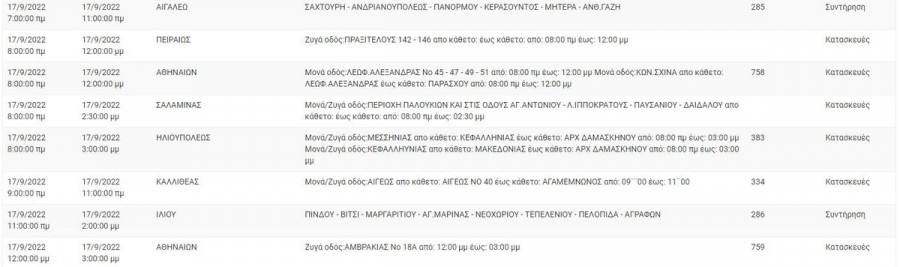 Οι περιοχές που θα επηρεαστούν είναι οι εξής:Αθήνα, Πειραιάς, Περιστέρι και Χαϊδάρι.