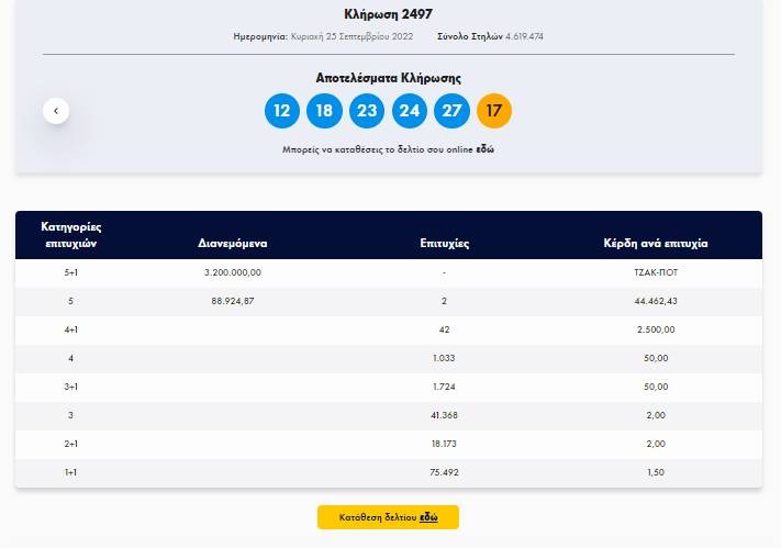 Αξίζει να σημειωθεί ότι από την αποψινή κλήρωση αναδείχθηκαν δύο επιτυχημένα δελτία που κερδίζουν από 44.462,43 ευρώ το κάθε ένα!