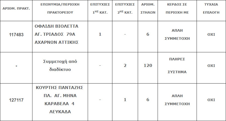 Σημειώνεται ότι από την αποψινή κλήρωση αναδείχθηκαν επίσης δύο επιτυχημένα δελτία στην δεύτερη κατηγορία που κερδίζουν από 27.145,93 ευρώ το κάθε ένα.
