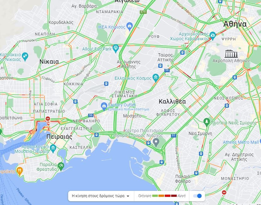 Οι χάρτες κυκλοφορίας, επίσης, δείχνουν αρκετά πυκνή ροή οχημάτων και στους δρόμους γύρω από το λιμάνι του Πειραιά, ενώ όσο περνάει η ώρα θα αυξάνονται τα οχήματα και στις άλλες κεντρικές οδικές αρτηρίες στο λεκανοπέδιο.