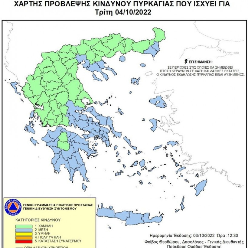 Ο κίνδυνος είναι χαμηλός. Η πιθανότητα για εκδήλωση πυρκαγιάς δεν είναι ιδιαίτερα υψηλή. Εάν εκδηλωθεί πυρκαγιά, οι συνθήκες (κατάσταση καύσιμης ύλης, μετεωρολογικές συνθήκες) δεν θα ευνοήσουν τη γρήγορη εξέλιξή της.