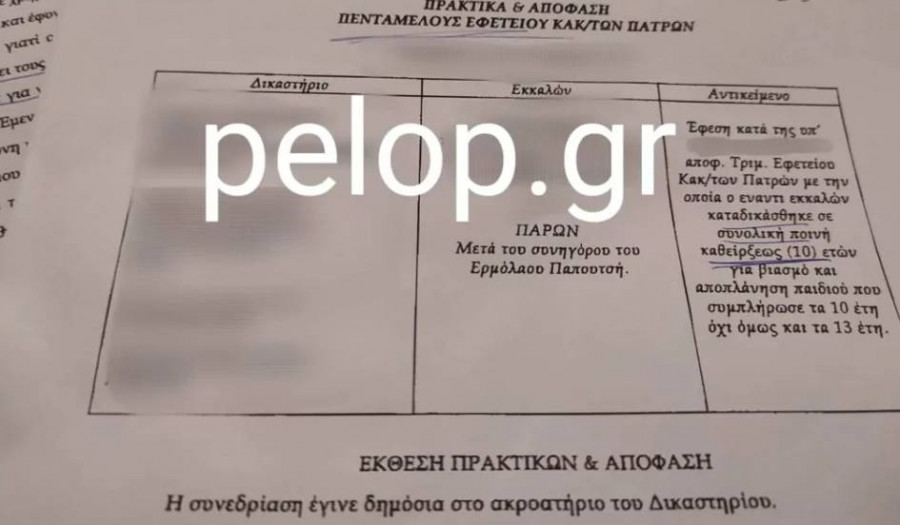 Επεσήμανε δε, ότι:«Στη συγκεκριμένη υπόθεση, το Τριμελές Εφετείο Κακουργημάτων Πατρών αποτελούμενο από κατά τεκμήριο ανώτερους και έμπειρους δικαστικούς λειτουργούς, διέγνωσε ομόφωνα την ενοχή του κατηγορουμένου για την αποτρόπαια πράξη του βιασμού ανηλίκου και της αποπλάνησης παιδιού και του επέβαλε ποινή κάθειρξης 10 ετών. Στη συνέχεια, το Πενταμελές Εφετείο Κακουργημάτων Πατρών, ήτοι ένα από τα ανώτερα δικαστήρια ουσίας στη χώρα, διέγνωσε για δεύτερη φορά ομόφωνα την ενοχή του κατηγορουμένου για την ίδια πράξη και, αν και του αναγνώρισε ελαφρυντικό, του επέβαλε ποινή κάθειρξης μειωμένη κατά 1μόνο έτος, ήτοι ποινή κάθειρξης 9 χρόνων. Δηλαδή δύο από τα Ανώτατα Δικαστήρια ουσίας της χώρας, τον κήρυξαν ένοχο και τον καταδίκασαν, ευθυγραμμιζόμενοι με το αποδεικτικό υλικό, όπως εκθέσεις παιδοψυχιάτρου και γυναικολόγου, που εξέτασαν το παιδί και κυρίως με τις καταθέσεις του ιδίου, οι οποίες στα βασικά τους σημεία και κυρίως στις αποκρουστικές λεπτομέρειες τέλεσης της εις βάρους του πράξης, ήταν ίδιες και απαράλλαχτες από την πρώτη στιγμή έως την κατάθεσή του στο Εφετείο, παρά το