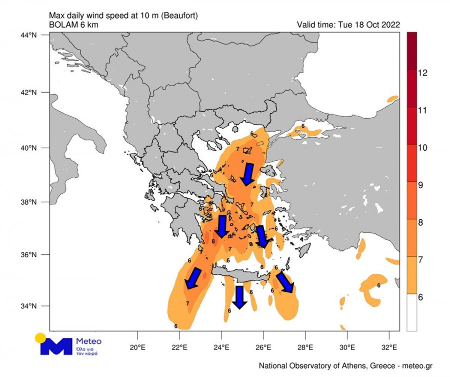 Σύμφωνα με τα προγνωστικά στοιχεία του Εθνικού Αστεροσκοπείου Αθηνών / meteo.gr, ενισχυμένοι άνεμοι βορείων διευθύνσεων θα επικρατήσουν στο Αιγαίο την Τρίτη 18 Οκτωβρίου, με τις εντάσεις τους να φτάνουν τοπικά τα 8 μποφόρ. Αξίζει να σημειωθεί ότι κατά τη διάρκεια της νύχτας οι μέγιστες ριπές του ανέμου στην Εύβοια έφτασαν τα 116 km/h, ενώ στην Πάρνηθα άγγιξαν τα 100 km/h.