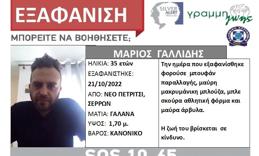Όπως αναφέρεται, ο Μάριος Γαλλίδης, 35 ετών, το απόγευμα της 21/10/22 αποχώρησε από το σπίτι του, στο Νέο Πετρίτσι Σερρών και έκτοτε δεν έχει δώσει σημεία ζωής.