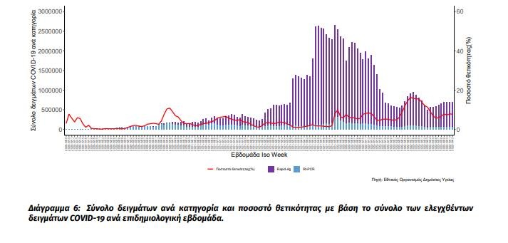 Δείγματα που έχουν ελεγχθεί: Την εβδομάδα αναφοράς, το ποσοστό θετικότητας ήταν 7,66% σε σύνολο 691.863 εργαστηριακών ελέγχων (RT-PCR/Rapid-Ag) με το μέσο όρο επταημέρου να είναι 98.838 δείγματα (0% εβδομαδιαία
