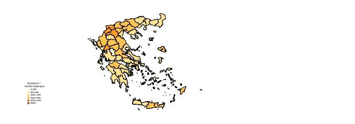 Γεωγραφική διασπορά: Ο χάρτης αποτυπώνει τη γεωγραφική κατανομή των κρουσμάτων COVID-19 των τελευταίων 14 ημερών ανά Περιφερειακή Ενότητα της χώρας, με βάση την δηλωθείσα διεύθυνση μόνιμης κατοικίας του ασθενούς, ή τη διεύθυνση προσωρινής διαμονής για τους τουρίστες και άλλους προσωρινά διαμένοντες στην Ελλάδα.
