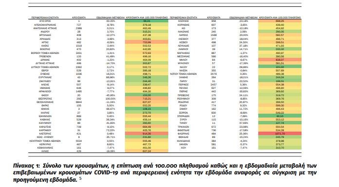 Κατανομή κρουσμάτων την εβδομάδα αναφοράς: Στο Πίνακα 1 παρουσιάζεται τo σύνολο των κρουσμάτων, η επίπτωση ανά 100.000 πληθυσμού καθώς και η εβδομαδιαία μεταβολή των επιβεβαιωμένων κρουσμάτων COVID-19 ανά περιφερειακή ενότητα την εβδομάδα αναφοράς σε σύγκριση με την προηγούμενη εβδομάδα.