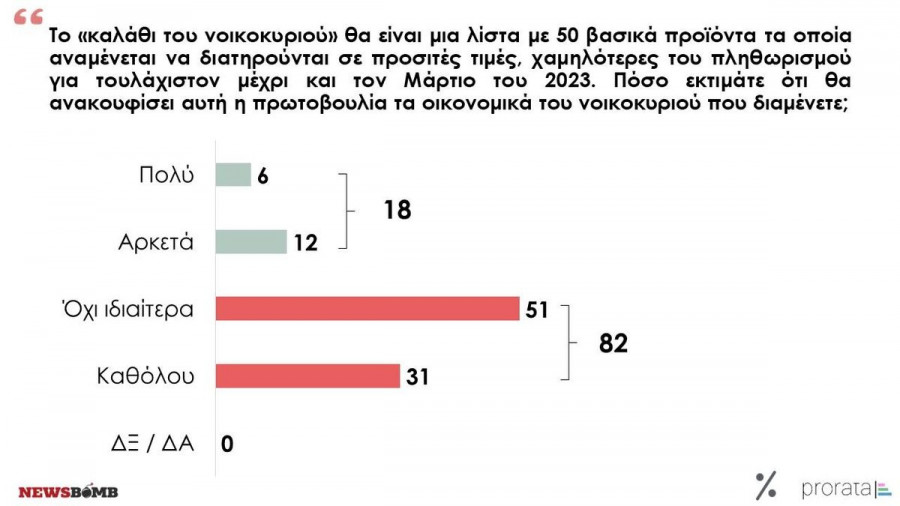 Αναμφίβολα, το κύμα ακρίβειας αποτελεί τον νούμερο ένα πονοκέφαλο για την κοινωνία κατά την τρέχουσα περίοδο, με την πλειοψηφία των νοικοκυριών να δυσκολεύεται να ανταπεξέλθει οικονομικά. Ως κομμάτι της λύσης, θεσπίστηκε το «καλάθι του νοικοκυριού», μία λίστα από 50 βασικά προϊόντα των οποίων η τιμή - τουλάχιστον όπως διακηρύττει η κυβέρνηση - θα παραμείνει σε χαμηλά επίπεδα έως και τις αρχές της άνοιξης. Σε αυτό το πλαίσιο, η νέα έρευνα της Prorata για το Neswsbomb.gr διερεύνησε τις εκτιμήσεις των πολιτών ως προς την επιδραστικότητα του μέτρου στα οικονομικά των νοικοκυριών αλλά και την αίσθηση τους ως προς το αν έχει μειωθεί ή αυξηθεί η αισχροκέρδεια το τελευταίο διάστημα: Εν τέλει, θα ανακουφιστούν οι πολίτες από την εφαρμογή του μέτρου; Συνολικότερα, έχει περιοριστεί ή όχι η αισχροκέρδεια σε σχέση με τις τιμές των βασικών προϊόντων;