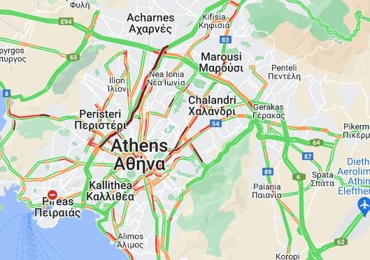 Μποτιλιάρισμα παρατηρείται και στα δύο ρεύματα της Κηφισίας, της Μεσογείων, της λεωφόρου Αθηνών και στους δρόμους γύρω από το Σύνταγμα.