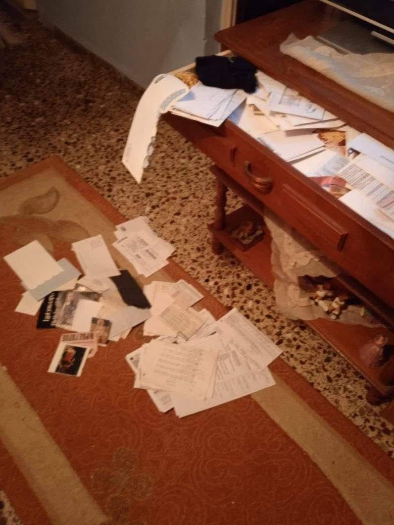 «Πέσαμε για ύπνο στις 12.30 το βράδυ (σ.σ. το βράδυ της Τετάρτης) και κατά τις 2, 3 δεν θυμάμαι γιατί δεν είχα ρολόι δίπλα μου, ακούσαμε θόρυβο. Οι διαρρήκτες μπήκαν μέσα στο σπίτι σπρώχνοντας το ραγισμένο τζάμι της εξώπορτας το οποίο είχαμε κολλημένο. Έβαλαν το χέρι από μέσα, και καθώς είχα τα κλειδιά από πίσω, ξεκλείδωσαν και εισέβαλλαν στο σπίτι ανάβοντας και τα φώτα. Ο γαμπρός μου απουσίαζε και μέσα στο σπίτι ήμασταν εγώ και η κόρη μου. Μόλις τους καταλάβαμε ότι οι δράστες μπήκαν στο σπίτι βάλαμε τα κεφάλια μας κάτω από την κουβέρτα και μέχρι να φύγουν κάναμε ότι κοιμόμασταν. Είχαν χρόνο και έψαξαν όλο το σπίτι, παρόλο που μας κατάλαβαν ότι ήμασταν εκεί. Δεν μας πλησιάσανε αλλά μπήκαν στο δωμάτιο και αδειάσανε συρτάρια και ντουλάπες», είπε αρχικά η κα Νάννου.