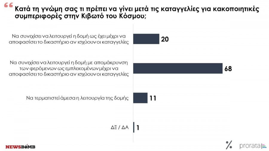Με την έρευνα να είναι εν εξελίξει η Prorata διερεύνησε τη γνώμη των αναγνωστών/τριών του Newsbomb.gr- οι οποίοι σε μεγάλο βαθμό λειτουργούν και ως «μικρογραφία» της ελληνικής κοινωνίας - ως προς το τι θεωρούν ότι πρέπει να γίνει στην Κιβωτό μετά τις καταγγελίες καθώς και ποιος θεωρούν ότι φέρει τη μεγαλύτερη ευθύνη για πιθανές κακοποιητικές συμπεριφορές σε αντίστοιχες δομές.