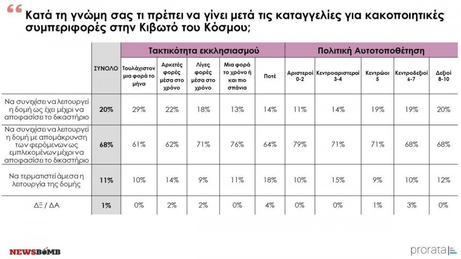 Πιο συγκεκριμένα, είναι αρκετά πιο πιθανό να συναντήσει κανείς όσους και όσες επιθυμούν τη συνέχιση της λειτουργίας της δομής, χωρίς απομακρύνσεις προσώπων, στα κεντροδεξιά - δεξιά του πολιτικού φάσματος, καθώς και μεταξύ όσων εκκλησιάζονται τακτικά. Παρά την παραπάνω συσχέτιση, ωστόσο, η μεγάλη εικόνα, δεν αλλοιώνεται, καθώς ανεξαρτήτως της τακτικότητας του εκκλησιασμού και της πολιτικής αυτοτοποθέτησης των συμετεχόντων/ουσών, η μεγάλη πλειονότητα προκρίνει τη συνέχιση της λειτουργίας της δομής, αφού πρώτα απομακρυνθούν τα καταγγελλόμενα πρόσωπα.