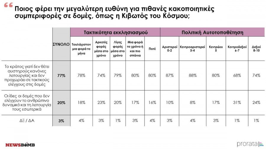 Τέλος, εξαιρετικό ενδιαφέρον προκύπτει και από τα ευρήματα που αφορούν στην απόδοση της κύριας ευθύνης για τέτοιες συμπεριφορές σε δομές παιδικής προστασίας: το 77% των ερωτώμενων θεωρεί ότι τη μεγαλύτερη ευθύνη για κακοποιητικές συμπεριφορές σε τέτοιου τύπου δομές φέρει το κράτος που δεν θέτει αυστηρούς κανόνες και δεν ασκεί ελεγκτικό του ρόλο, έναντι του 20% που θεωρεί ότι η ευθύνη βαραίνει κυρίως τις ίδιες τις δομές επειδή δεν ελέγχουν επαρκώς το ανθρώπινο δυναμικό και την εσωτερική τους λειτουργία.