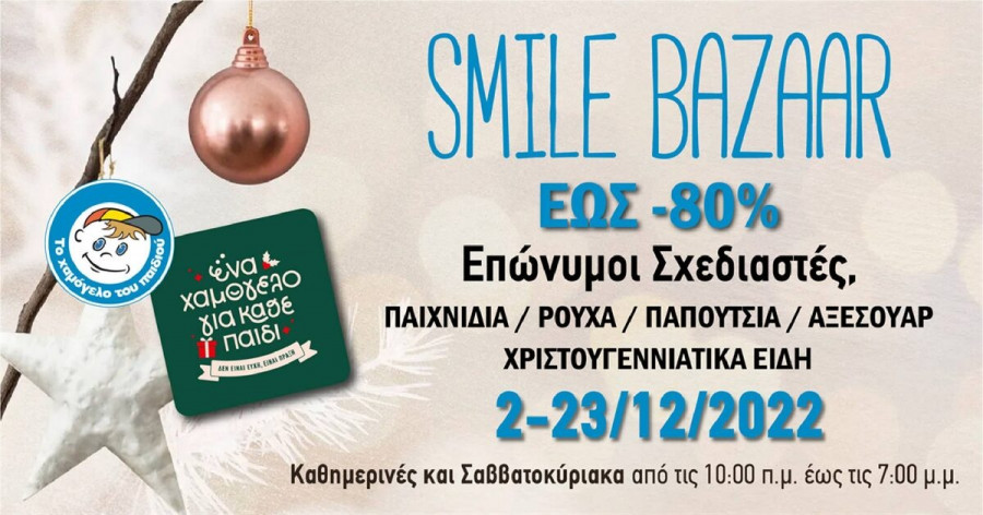 Με μεγάλη χαρά και φέτος «Το Χαμόγελο του Παιδιού» προσκαλεί μικρούς και μεγάλους στο Χριστουγεννιάτικο Smile Bazaar, το οποίο πραγματοποιείται από 2 έως 23 Δεκεμβρίου 2022, με δωρεάν είσοδο στους χώρους του Οργανισμού «Το Χαμόγελο του Παιδιού», Γαρυττού 80, Αγία Παρασκευή, 5ος όροφος (πλησίον μετρό Αγ. Παρασκευής).