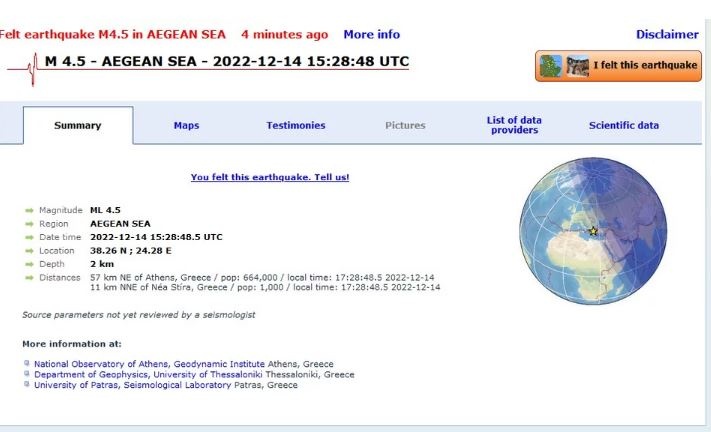 Σεισμός τώρα 4,3 Ρίχτερ κοντά στην Εύβοια - Αισθητός και στην Αττική