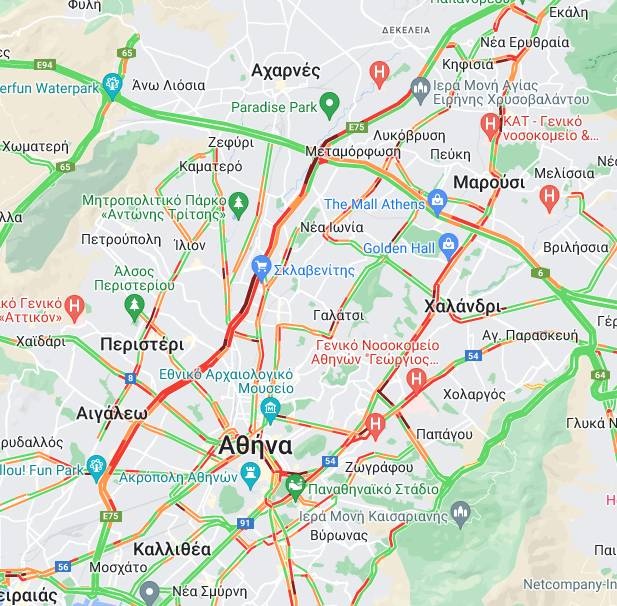 Δύσκολη είναι η κατάσταση και στους υπόλοιπους δρόμους του λεκανοπεδίου με την κίνηση στην Κηφισίας να ξεκινάει από την Εκάλη μέχρι το κέντρο της Αθήνας.