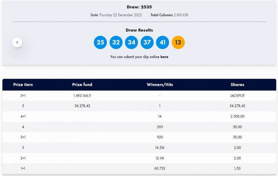 Υπενθυμίζεται ότι οι τυχεροί αριθμοί που ανέδειξε η αποψινή κληρωτίδα της περασμένης κλήρωσης ήταν οι 25, 32, 34, 37, 41 και Τζόκερ ο αριθμός 13.