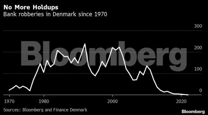 Μάλιστα, το 2021, στη Δανία σημειώθηκε μόνο μία ληστεία σε τράπεζα, σύμφωνα με τα στοιχεία της Finance Denmark, του μεγαλύτερου βιομηχανικού ομίλου της χώρας.