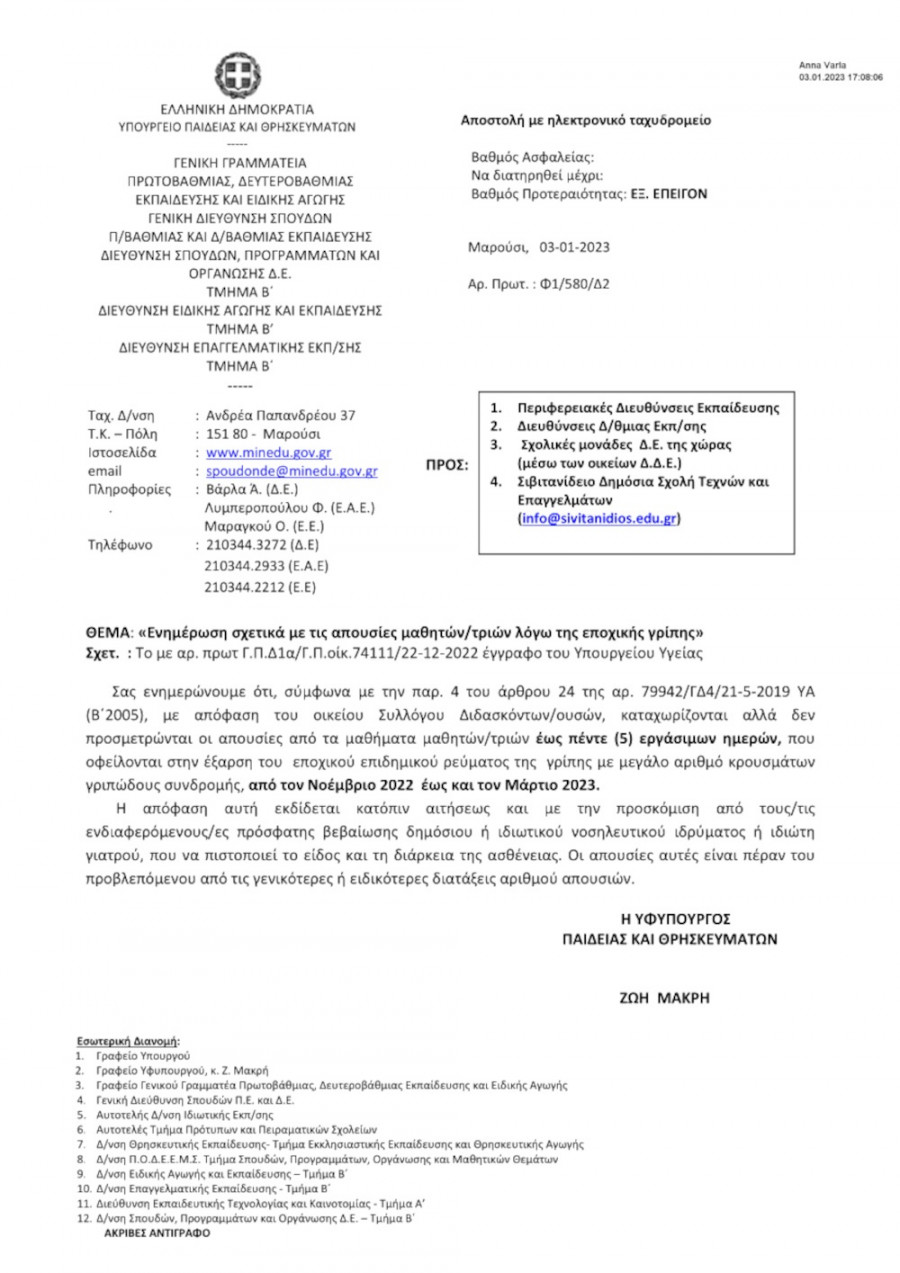 Συγκεκριμένα, το Υπουργείο Παιδείας και Θρησκευμάτων, ανταποκρινόμενο στην παγκόσμια έξαρση της γρίπης, απέστειλε εγκύκλιο σε όλα τα σχολεία της χώρας στην οποία αναφέρει ότι οι απουσίες πέντε εργάσιμων ημερών που οφείλονται σε εποχικό επιδημικό ρεύμα της γρίπης από τον Νοέμβριο 2022 έως και τον Μάρτιο 2023, πρέπει να καταχωρίζονται, χωρίς να προσμετρώνται.