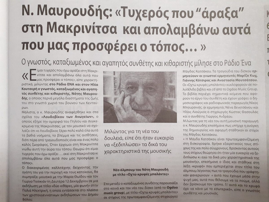 Λίγες ημέρες νωρίτερα και συγκεκριμένα στις 9 Δεκεμβρίου 2022, με αφορμή το νέο του άλμπουμ, αλλά και μια μουσική παράσταση που θα δίνονταν στον Βόλο, ο Νότης Μαυρουδής, συνομίλησε με τον Ηλία Κουτσερή, στο «Ράδιο Ένα» και πέρα απ΄τα όσα αφορούσαν στα δυο αυτά θέματα, εξύμνησε την Μακρινίτσα που ουσιαστικά είναι η φυσική συνέχεια της Κουκουράβας όπου ήταν το σπίτι του. Μέρος της συνέντευξης (η οποία ολοκληρωμένη θα ακουστεί στη μνήμη του, στη διάρκεια της εκπομπής του Ράδιο Ένα, σήμερα, μετά τις 10.30 το πρωί) είχαν δημοσιεύσει η ΜΑΓΝΗΣΙΑ και το magnesianews.gr, με τον τίτλο «Τυχερός που “άραξα” στη Μακρινίτσα και απολαμβάνω αυτά που μας προσφέρει ο τόπος… ».