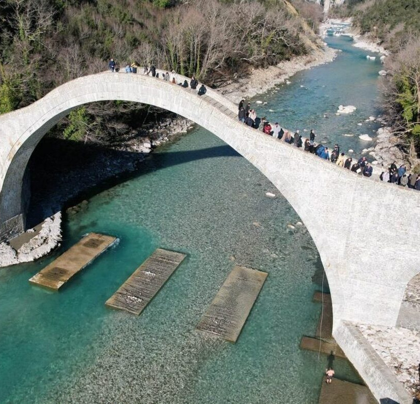 Θεοφάνια: Πλήθος κόσμου, ντόπιοι και επισκέπτες έφτασαν το πρωί στο ιστορικό γεφύρι της Πλάκας.
