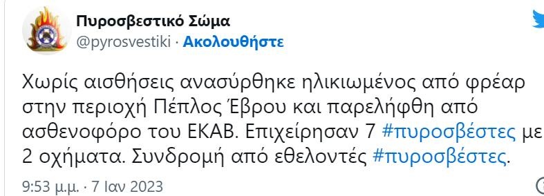 Επιτόπου έφτασαν 2 οχήματα με 7 Πυροσβέστες από την Αλεξανδρούπολη, αλλά και μέλη του Εθελοντικού Πυροσβεστικού Κλιμακίου Φερών. Άρχισε η επιχείρηση ανάσυρσής του η οποία δεν ήταν εύκολη, αφού το πηγάδι ήταν στενό, με πλάτος περίπου μισό μέτρο. Όταν έβγαλαν τον άτυχο 80χρονο, διαπιστώθηκε πως ήταν νεκρός. Τον παρέλαβε το ασθενοφόρο του ΕΚΑΒ που έφτασε επίσης στο σημείο του χωριού Πέπλος, ενώ η ανακοίνωση του Πυροσβεστικού Σώματος για το συμβάν αναφέρει: