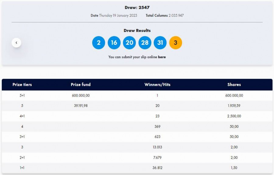 Αξίζει να σημειωθεί ότι από την αποψινή κλήρωση εκτός από τον μεγάλο νικητή που κέρδισε το ποσό των 600.000 ευρώ, αναδείχθηκαν στην δεύτερη κατηγορία (5αρια) 20 επιτυχημένα δελτία που κερδίζουν από 1.959,59 ευρώ το κάθε ένα!