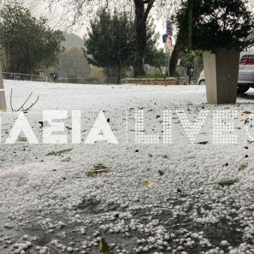 Η σφοδρή κακοκαιρία «χτύπησε» και την Αχαϊα. Η Αρχαία Ολυμπία «ντύθηκε στα λευκά» λόγω της σφοδρής χαλαζόπτωσης στην περιοχή. Οι ζημιές από τη χαλαζόπτωση είναι μεγάλες ειδικά στις γεωργικές καλλιέργιες.