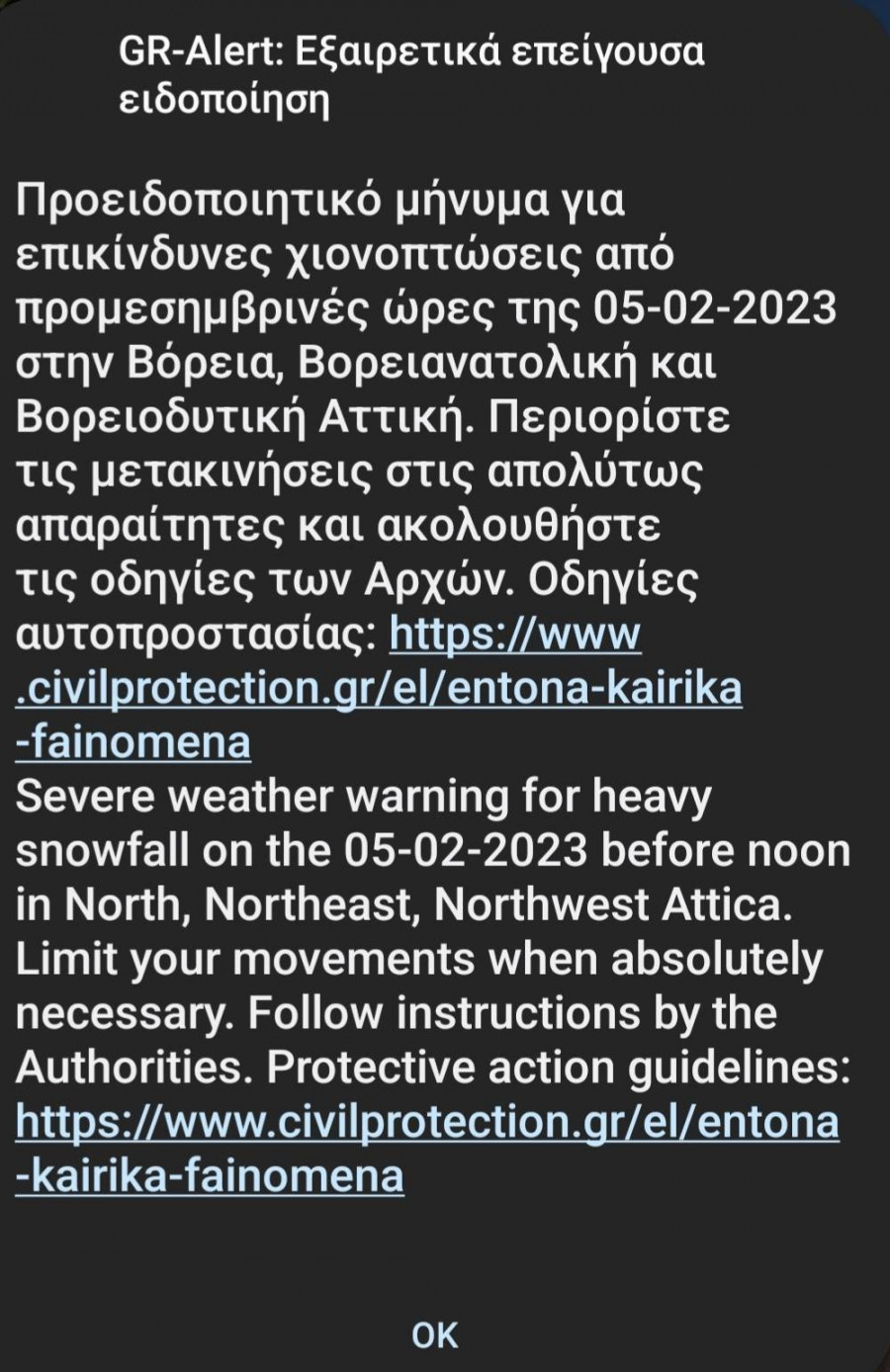 «Προειδοποιητικό μήνυμα για επικίνδυνες χιονοπτώσεις από προμεσημβρινές ώρες της 5-2-2023 στη Βόρεια, Βορειοανατολική και Βορειοδυτική Αττική. Περιορίστε τις μετακινήσεις στις απολύτως απαραίτητες και ακολουθήστε τις οδηγίες των Αρχών», αναφέρει μεταξύ άλλων το μήνυμα που ήχησε λίγο πριν από τις 19:00 στα κινητά των κατοίκων της Αττικής και των υπόλοιπων περιοχών.