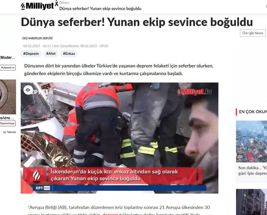 Ιδιαίτερη αναφορά στην ηρωική ΕΜΑΚ γίνεται και στον τουρκικό Τύπο με τη Milliyet να αναφέρεται στη χαρά των Ελλήνων διασωστών.