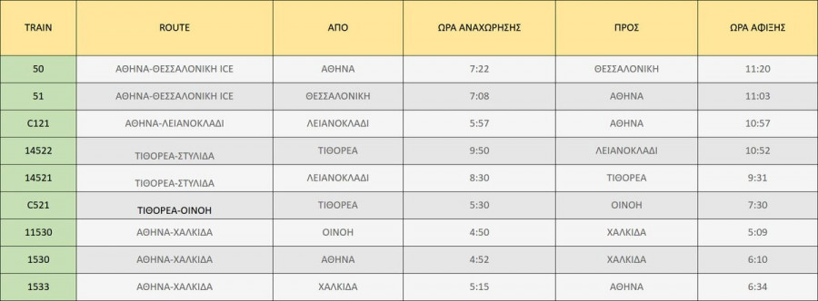 Συγκεκριμένα, σύμφωνα με ανακοίνωση από την Hellenic Train, σήμερα Πέμπτη 9/2/2023, καταργούνται τα δρομολόγια του πίνακα που ακολουθεί:
