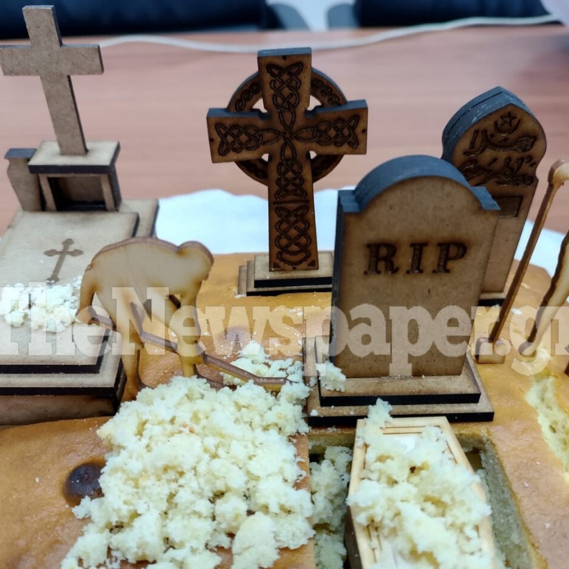 Οι εργαζόμενοι στη Διεύθυνση Κοιμητηρίων του Δήμου Βόλου έκοψαν το πρωί της Πέμπτης την πρωτοχρονιάτικη βασιλόπιτα για το καλό του νέου έτους, η οποία είχε σχεδιαστεί σαν ένα... νεκροταφείο!
