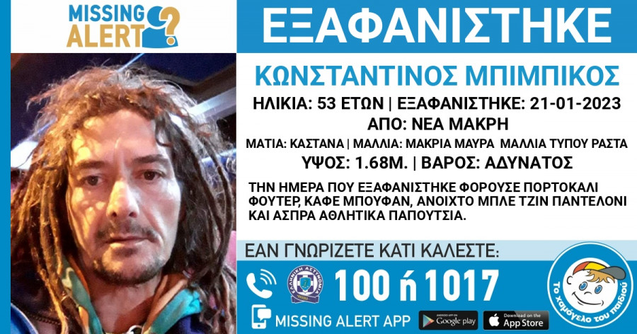 Ο Κωνσταντίνος Μπιμπίκος, εξαφανίστηκε στις 21/01/2023, από την περιοχή της Νέας Μάκρης.