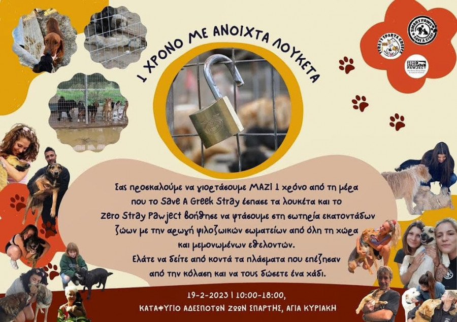 «Την Κυριακή 19 Φεβρουαρίου, από τις 10:00 το πρωί μέχρι τις 18:00 το απόγευμα, σας περιμένουμε στο Καταφύγιο Αδέσποτων Ζώων του Δήμου Σπάρτης στην Αγία Κυριακή για να γιορτάσουμε 1 χρόνο με ανοιχτά λουκέτα.