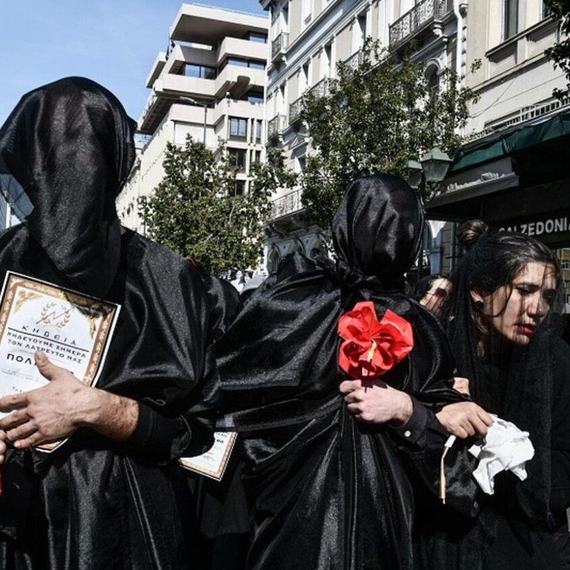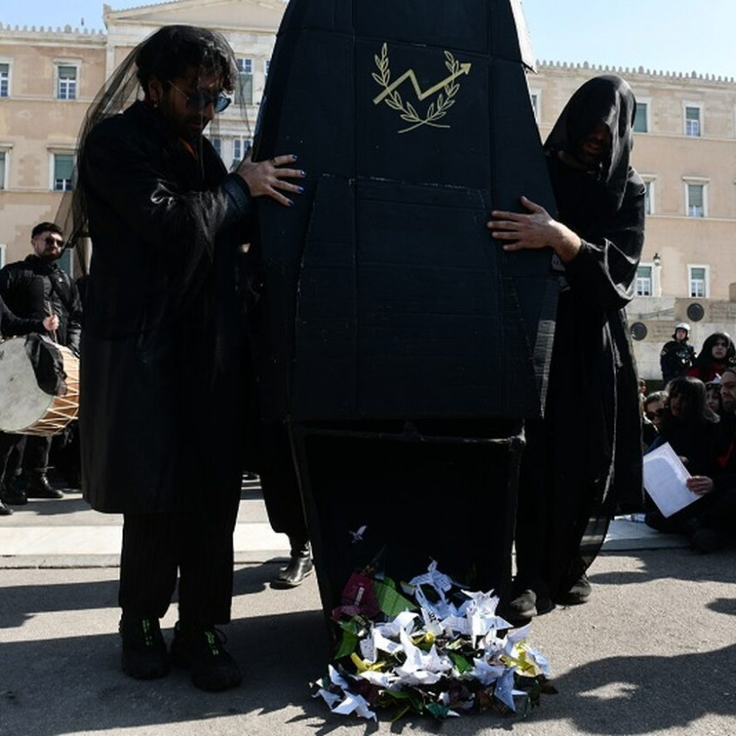Σήμερα, Παρασκευή (17/2), βρέθηκαν έξω από το ΣτΕ, μαυροφορεμένοι και κρατώντας ένα αυτοσχέδιο φέρετρο ενω πραγματοποίησαν και πορεία προς τη Βουλή.
