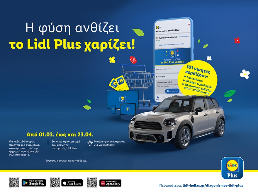 Από την 1 Μαρτίου έως και τις 23 Απριλίου 2023 οι χρήστες του Lidl Plus έχουν την ευκαιρία να διεκδικήσουν 1 αυτοκίνητο Mini Countryman, 50.000€ σε εκπτωτικά κουπόνια και 50 μοναδικά δώρα τεχνολογίας