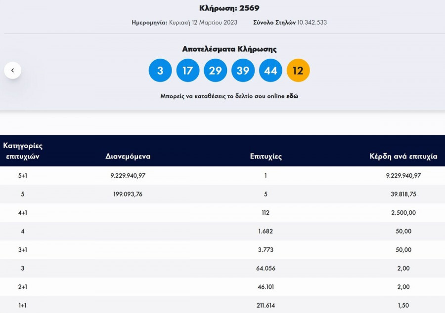 Οι τυχεροί αριθμοί που ανέδειξε η κληρωτίδα είναι οι: 39, 29, 3, 44, 17 και Τζόκερ ο αριθμός 12.