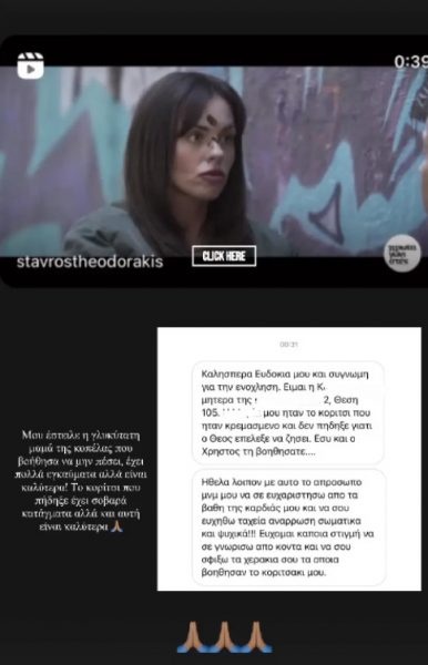 «Καλησπέρα Ευδοκία μου και συγγνώμη για την ενόχληση. Είμαι η Κ. μητέρα της … Ήταν το κορίτσι που ήταν κρεμασμένο και δεν πήδηξε γιατί ο Θεός επέλεξε να ζήσει. Εσύ και ο Χριστός τη βοηθήσατε. Ήθελα λοιπόν, με αυτό το απρόσωπο μήνυμα να σε ευχαριστήσω από τα βάθη της ψυχής μου και να σου ευχηθώ ταχεία ανάρρωση σωματικά και ψυχικά! Εύχομαι κάποια στιγμή να σε γνωρίσω από κοντά και να σου σφίξω τα χεράκια σου, τα οποία βοήθησαν το κοριτσάκι μου», έγραφε το συγκινητικό μήνυμα που δέχτηκε.