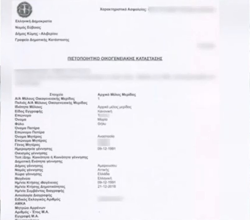 Κρίσιμος είναι και ο ρόλος της γυναίκας η οποία εμφανίστηκε ως μάρτυρας και η ίδια φαίνεται να την φιλοξενούσε στο Αλιβέρι. Στην περιοχή δηλαδή όπου κατάφερε να γίνει επισήμως δημότης στις 21 Δεκεμβρίου του 2018, όπως φαίνεται και στο πιστοποιητικό οικογενειακής της κατάστασης που έρχεται στη δημοσιότητα.
