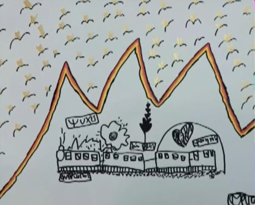 Τέλος, αναφέρθηκε στη συγκλονιστική ζωγραφιά της 8χρονης εγγονής του, η οποία από αυτά που άκουγε για το δυστύχημα ζωγράφισε το μοιραίο τρένο και τις ψυχές που χάθηκαν.