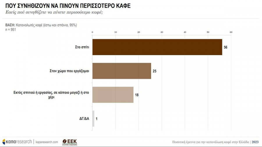 Η κατανάλωση καφέ είναι μια ισχυρή νεοελληνική παράδοση, καθότι το 95% των Ελλήνων αγοράζουν καφέ. Ενδεικτικό είναι το γεγονός ότι περίπου 8 στους 10 ερωτηθέντες πίνουν καθημερινά καφέ (84%), ενώ οι περισσότεροι από αυτούς που δεν πίνουν (66%), φροντίζουν να εφοδιάζουν με καφέ το νοικοκυριό τους. Το 50% των ερωτηθέντων θα καταναλώσουν πάνω από έναν καφέ την ημέρα (συνήθως 2 ή 3).