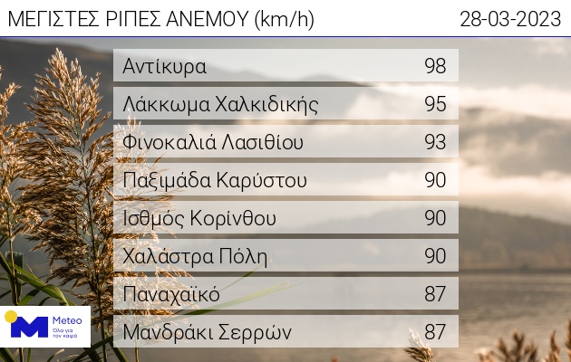 Να σημειώσουμε τέλος ότι στην Αντίκυρα Βοιωτίας, είχαμε νωρίτερα (19:30’) τη μέγιστη ριπή ανέμου που έφτασε τα 98 χλμ./ώρα.