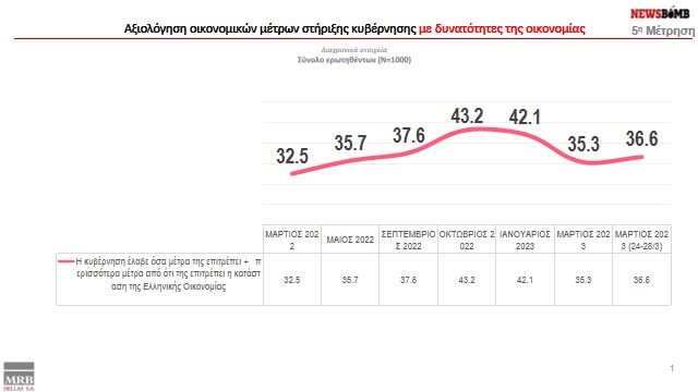 Οι περισσότεροι πολίτες και συγκεκριμένα το 55% θεωρούν ότι η κυβέρνηση έχει λάβει λιγότερα μέτρα από αυτά που της επιτρέπει η κατάσταση της ελληνικής οικονομίας -μια σαφή τάση που εκφράζει τη βούληση για την επιπλέον λήψη μέτρων ανακούφισης. Ωστόσο, είναι σημαντικό το ποσοστό (36,6%) όσων θεωρούν ότι η κυβέρνηση έχει λάβει τα μέτρα που πρέπει δεδομένης της κατάστασης ή ακόμα περισσότερα. Πάντως, το ποσοστό αυτό είναι αυξημένο σε σχέση με το αντίστοιχο του περσινού Μαρτίου, οπότε και την ίδια απάντηση έδωσε το 32,5%. Το «peak» ήταν ο περασμένος Οκτώβριος, οπότε και το 43,2% εκτιμούσε τα μέτρα της κυβέρνησης, για να πέσει στο σημερινό 36,6%.