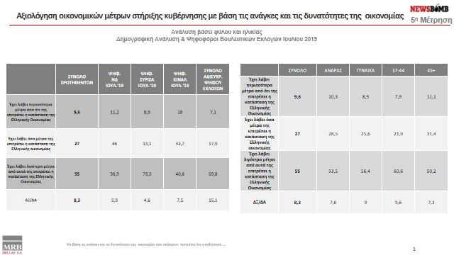 Η διαφοροποίηση μεταξύ των ψηφοφόρων των κομμάτων είναι και εδώ σημαντική, με αυτούς του ΠΑΣΟΚ πάντως να κάνουν την έκπληξη και να ξεπερνούν με μεγάλη διαφορά αυτούς των άλλων κομμάτων όσον αφορά στην απάντηση ότι η κυβέρνηση «έχει λάβει περισσότερα μέτρα από ότι της επιτρέπει η κατάσταση της οικονομίας». Οι ψηφοφόροι του ΚΙΝΑΛ το πιστεύουν αυτό σε ποσοστό 19%, που σε αυτούς της ΝΔ πέφτει στο 11,2% και σε αυτούς του ΣΥΡΙΖΑ στο 8,9%. Οι οπαδοί του κυβερνώντος κόμματος στην πλειοψηφία τους θεωρούν ότι τα μέτρα που λήφθησαν ήταν αυτά που επιτρέπει η οικονομία (46%), μια θέση που οι οπαδοί του ΣΥΡΙΖΑ συμμερίζονται μόλις σε ποσοστό 13,1%. Αντίστοιχα, το 73,3% των ψηφοφόρων του ΣΥΡΙΖΑ θεωρεί ότι η κυβέρνηση έλαβε λιγότερα μέτρα από ότι της επιτρέπουν τα δημοσιονομικά, άποψη με την οποία συμφωνεί οι υποδιπλάσιοι των ψηφοφόρων της ΝΔ (36,9%) και το 40,8% αυτών του ΠΑΣΟΚ.