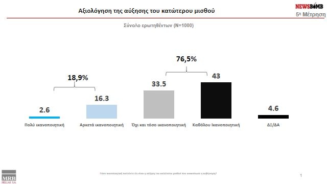 Όσον αφορά στην πολυαναμενόμενη και πολυδιαφημισμένη αύξηση του κατώτατου μισθού που ανακοινώθηκε πρόσφατα, οι 3 στους 4 δεν τη θεωρούν ικανοποιητική, ενώ «πολύ» ή «αρκετά» ικανοποιητική τη θεωρεί μόλις το 18,9% των πολιτών. Οι πιο αυστηροί εδώ είναι οι ψηφοφόροι του ΣΥΡΙΖΑ, με μόλις το 7% να θεωρεί ικανοποιητική την αύξηση -αντίστοιχα της ΝΔ το 37,8% και του ΠΑΣΟΚ το 41,9%.
