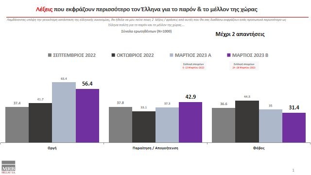 Είναι πολύ χαρακτηριστικό και αναμενόμενο, ότι το συναίσθημα της οργής κορυφώθηκε έπειτα από το δυστύχημα των Τεμπών. Σε σχέση με τον περασμένο χειμώνα, το ποσοστό των πολιτών που απάντησε ότι η λέξη που τον εκφράζει είναι η «οργή» εκτοξεύτηκε κατά 25% περίπου, και από το 37,4% του περασμένου Σεπτεμβρίου, στο 63,4% στις αρχές Μαϊου. Ωστόσο, διαφαίνεται μια τάση αποκλιμάκωσης αυτού του συναισθήματος, από στο δεύτερο μισό του Μαρτίου, υπάρχει πτώση που δεν είναι αμελητέα, κατά 7 μονάδες και συγκεκριμένα από το 63,4% στο 56,4%.