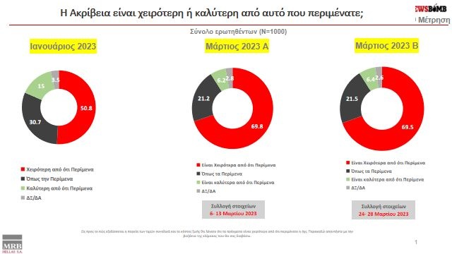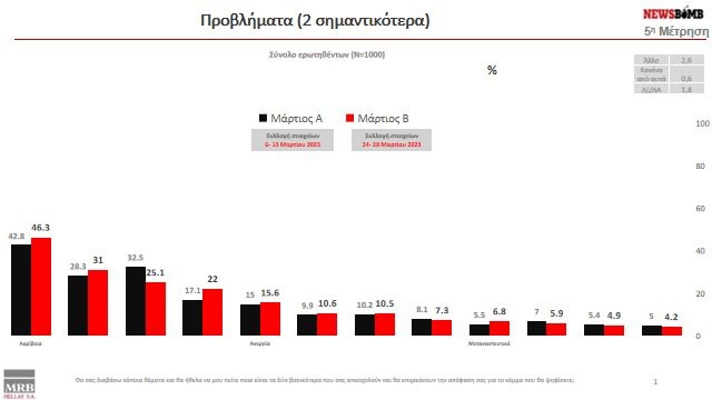 Σε ακόμα μια δημοσκόπηση, η Ακρίβεια χαρακτηρίζεται από τους πολίτες ως το σημαντικότερο πρόβλημα, με την τάση μάλιστα να είναι αυξητική μέσα στο Μάρτιο -σε ποσοστό 42,8% στις αρχές του μήνα και 46,3% στο δεύτερο μισό. Ακολουθεί η Έλλειψη διαφάνειας/διαφθορά σε ποσοστό 31%, αυξανόμενο μέσα στον μήνα, και η «Ορθή λειτουργία τους κράτους σε θέματα αποφυγής δυστυχημάτων». Ωστόσο, εδώ η τάση, και όσο περνάνε οι εβδομάδες από το δυστύχημα των Τεμπών, βαίνει μειούμενη, από το 32,5% στις αρχές του μήνα, στο 25,1%.