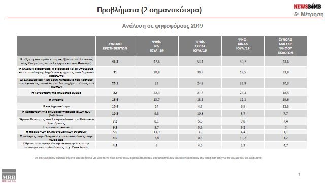 Ακολουθούν τα προβλήματα, χωρίς σημαντικές διαφοροποιήσεις μέσα στον Μάρτιο του 2023, στη Δημόσια Υγεία (22% το πιο πρόσφατο), της Ανεργίας (15,6%), της Εγκληματικότητας (10,6%), της Δημόσιας Παιδείας (10,5%), της ποιότητας των εκπροσώπων του πολιτικού συστήματος (7,3%), του μεταναστευτικού (6,8%), τις ελληνοτουρκικές σχέσεις (5,9%) -εδώ όσο μειώνεται η προκλητική τουρκική ρητορική μειώνεται και η ανησυχία- οι επιπτώσεις από τον πόλεμο της κοινωνίας (4,9%) και τέλος η ποιότητα του πολιτεύματος, με αναφορά στις υποκλοπές (4,2%).