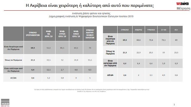 Στο ερώτημα εάν «η Ακρίβεια είναι χειρότερη ή καλύτερη από αυτό που περιμένατε» η τάση είναι πολύ αυξητική τον Μάρτιο, σε σχέση με τον περασμένο Ιανουάριο, με αυτούς που απαντούν ότι είναι χειρότερη να έχουν αυξηθεί κατά 20% από τότε και να φτάνουν σχεδόν το 70% των πολιτών. Κι εδώ, οι ψηφοφόροι της Νέας Δημοκρατίας βλέπουν καλύτερα τα πράγματα από ότι αυτοί του ΣΥΡΙΖΑ – την ακρίβεια τη βρίσκουν χειρότερη το 55,1% έναντι του 81,5% του κόμματος της αξιωματικής αντιπολίτευσης, ενώ το ΠΑΣΟΚ είναι και πάλι κάπου στο μέσο (63,5%) αυτών των δύο τάσεων. Αντίστοιχα διαμορφώνονται τα ποσοστά μεταξύ των ψηφοφόρων, και στα άλλες δύο απαντήσεις, ενώ μεταξύ ανδρών και γυναικών, οι διαφορές είναι αμελητέες.