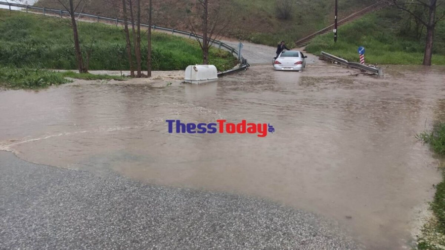 Σε περιοχή της Θέρμης, οι οδηγοί δυσκολεύονταν να διασχίσουν τον δρόμο λόγω του σχηματισμού ποταμών, ενώ η βροχή δεν σταματούσε καθόλου, σύμφωνα με το ρεπορτάζ του thesstoday.